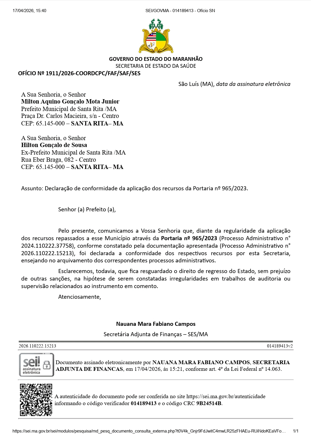 Um documento oficial do Governo do Estado do Maranhão atesta a correta aplicação de recursos públicos da saúde no município de Santa Rita, reforçando a transparência e a responsabilidade na gestão do ex-prefeito Hilton Gonçalo de Sousa. De acordo com o Ofício nº 1911/2026, emitido pela Secretaria de Estado da Saúde (SES/MA), foi declarada a […]