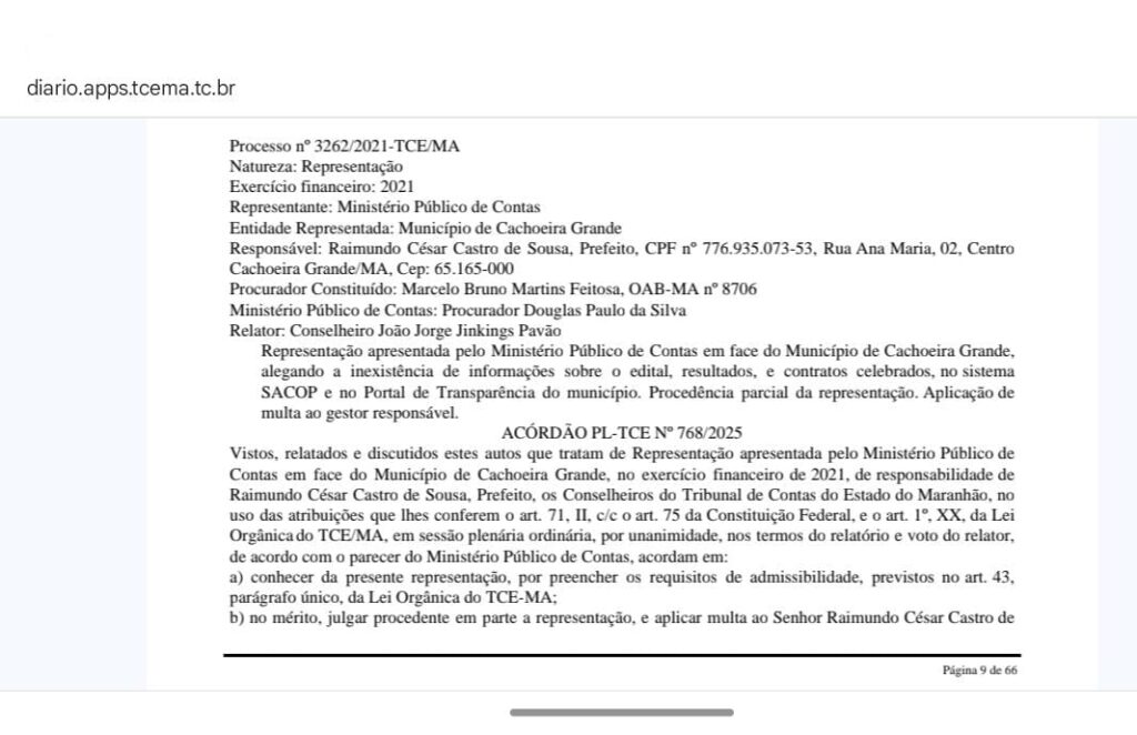 O Tribunal de Contas do Estado do Maranhão aplicou multa no prefeito de Cachoeira Grande, César Castro, após identificar falhas na transparência de informações públicas relacionadas a processos administrativos do município. A decisão consta no Acórdão nº 768/2025, resultado do julgamento da Representação nº 3262/2021, apresentada pelo Ministério Público de Contas.