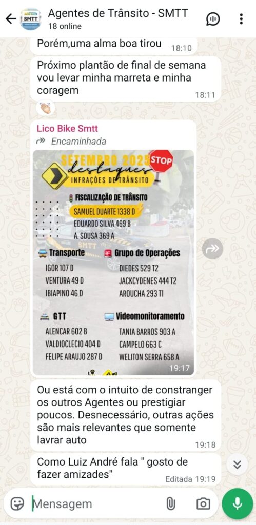 Uma denúncia recebida pelo portal SLZMA aponta uma prática controversa dentro da Secretaria Municipal de Trânsito e Transportes (SMTT) de São Luís. Segundo informações, um grupo de WhatsApp administrado por integrantes ligados ao sindicato dos agentes estaria divulgando um banner interno com os nomes dos profissionais que mais aplicaram multas na cidade, em tom de destaque e reconhecimento.