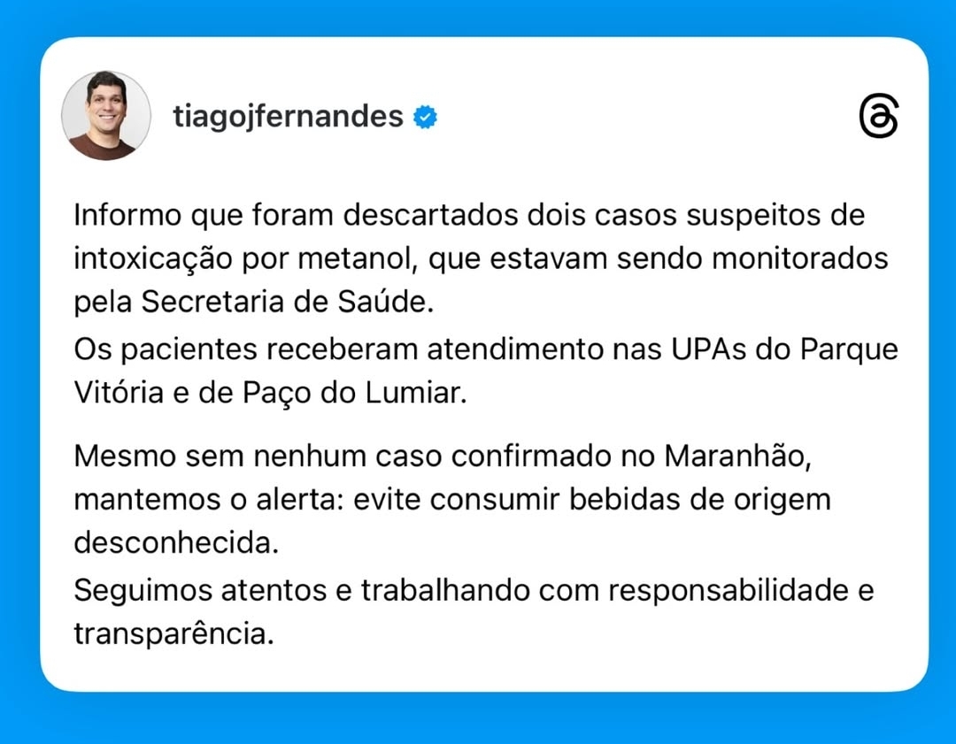 O secretário de Estado da Saúde, Tiago Fernandes, informou por meio das redes sociais que foram descartados dois casos suspeitos de intoxicação por metanol que estavam sendo monitorados pela Secretaria de Saúde do Maranhão.