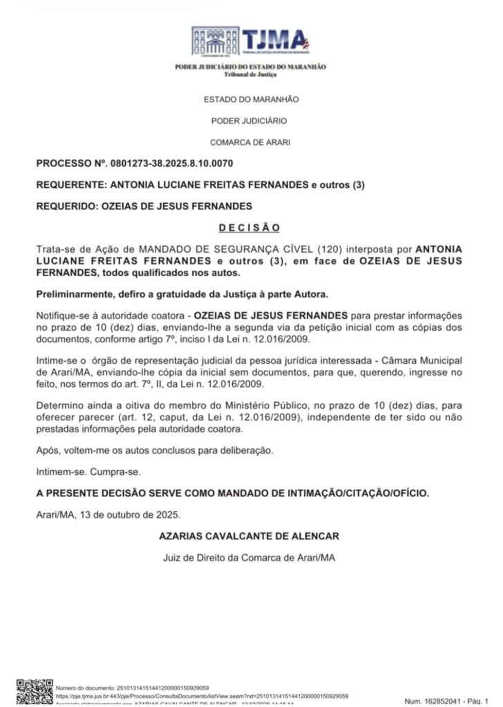 O juiz Azarias Cavalcante de Alencar, da Comarca de Arari, concedeu prazo de 10 dias para que o presidente da Câmara de Arari, Ozéias Fernandes, se manifeste sobre a decisão que indeferiu a abertura da CPI do Fundeb.