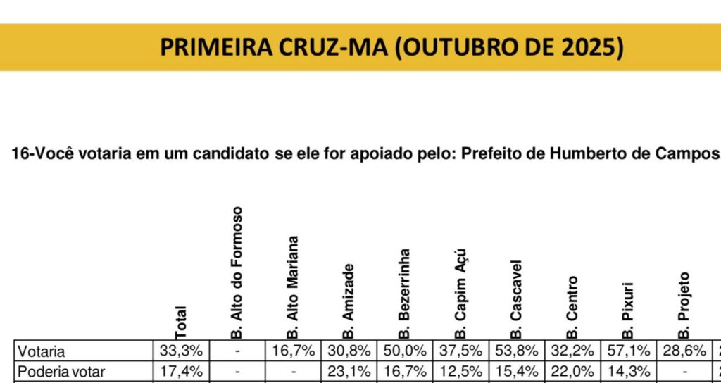 O bom desempenho do prefeito Luís Fernando, de Humberto de Campos, começa a ultrapassar os limites do município e já reflete de forma positiva em Primeira Cruz, cidade vizinha. É o que mostra uma pesquisa recente do Instituto Prever, realizada em outubro de 2025.