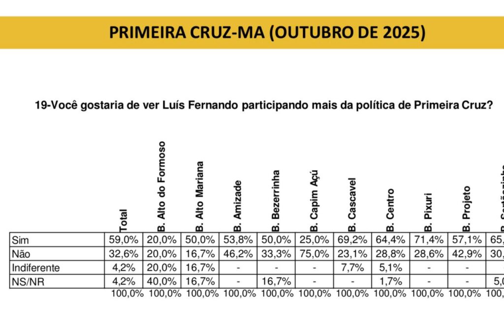 O levantamento ouviu moradores de Primeira Cruz e revelou que 33,3% dos entrevistados votariam em um candidato apoiado por Luís Fernando, enquanto outros 17,4% afirmaram que poderiam votar, caso ele estivesse envolvido na campanha.