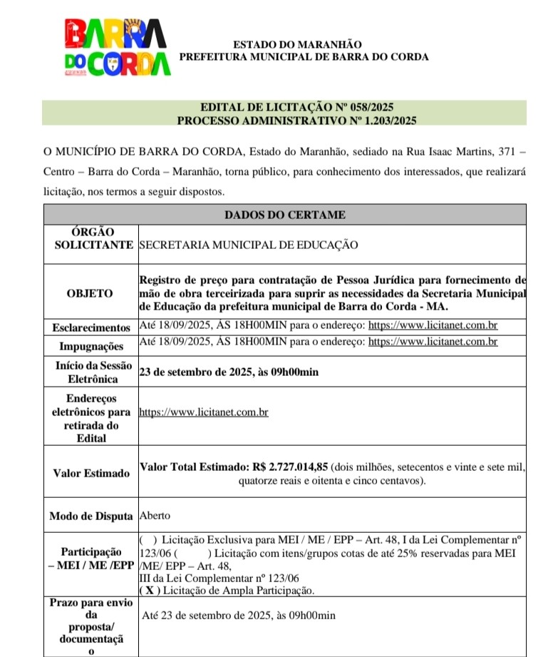 Essa é a pergunta que precisa ser respondida pela gestão municipal de Barra do Corda. No dia 23 de setembro foi aberta uma licitação no valor de R$ 2.727.014,85 para contratação de mão de obra terceirizada, mesmo após a prefeitura ter lançado recentemente dois editais de concurso público oferecendo 630 vagas, sendo 281 de provimento imediato e outras 349 para cadastro de reserva.