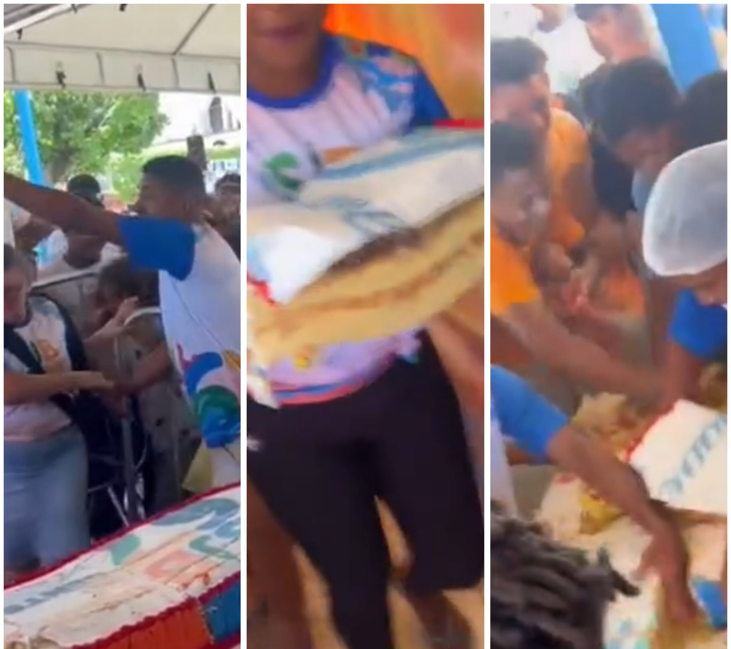 As imagens mostram o momento em que as grades de contenção foram abertas e uma multidão correu em direção ao bolo, transformando a celebração em uma cena de correria descontrolada. Pessoas usando baldes, sacolas e até bacias se amontoaram na tentativa de garantir um pedaço, causando aglomeração, confusão e desperdício do alimento.