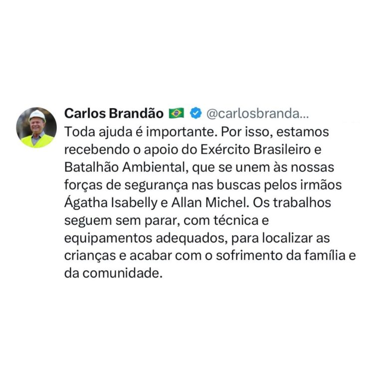 O governador Carlos Brandão anunciou nesta sexta-feira (9) o reforço das buscas pelas crianças Ágatha Isabelly e Allan Michel, que seguem desaparecidas no município de Bacabal, no Maranhão. A operação agora conta com apoio do Exército Brasileiro e do Batalhão Ambiental, ampliando o efetivo no trabalho de localização.